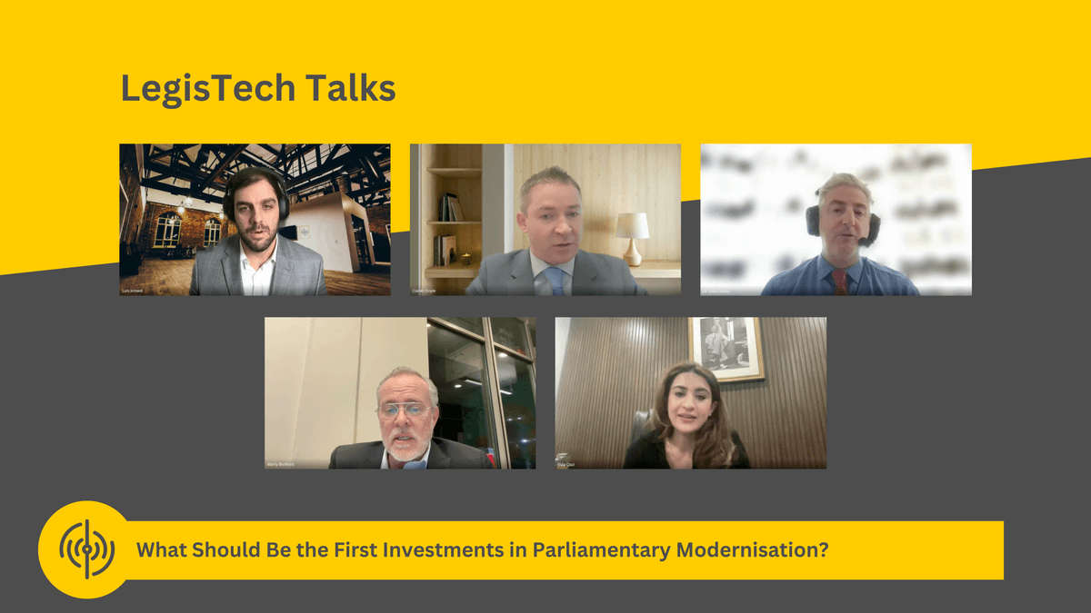 Moderated by Luís Kimaid, Executive Director of Bússola Tech, the panel brought together Ciaran Doyle, Assistant Secretary and CIO of the Houses of the Oireachtas (Ireland); Fotis Fitsilis, Head of Documentation and Research Service at the Hellenic Parliament (Greece); Rida Qazi, Special Advisor on Initiatives and Digital Transformation to the Senate of Pakistan; and Marty Bickford, Vice President at Xcential Legislative Technologies.